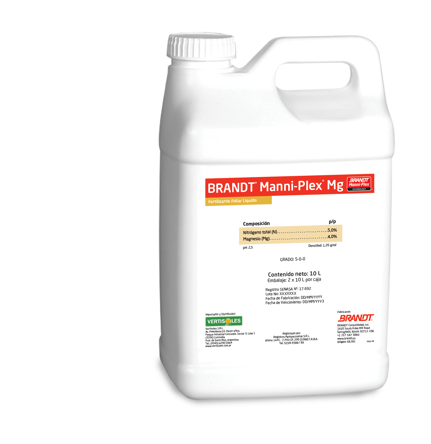 BRANDT® Manni-Plex® Mg es un suplemento foliar patentado que aporta magnesio altamente móvil y disponible en los puntos de crecimiento de la planta. Es una excelente herramienta para prevenir y corregir las deficiencias de manganeso y mejorar la salud vegetal en general.